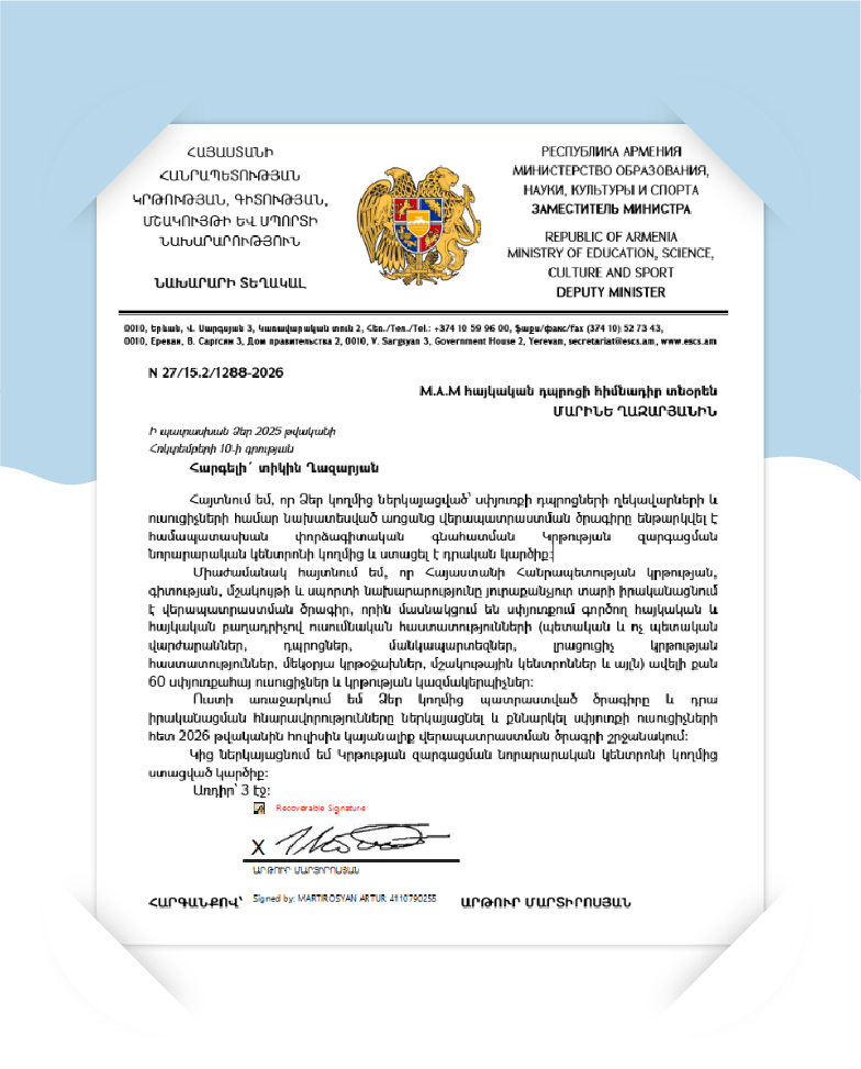 The program has been presented to the RA Ministry of Education, Science, Culture and Sports and has received a positive conclusion from the “Center for Educational Development and Innovation” foundation, once again highlighting its professional and educational value. Deputy Minister Artur Martirosyan proposed presenting the developed program and its implementation opportunities and discussing them within the framework of the upcoming professional development program for diaspora teachers.